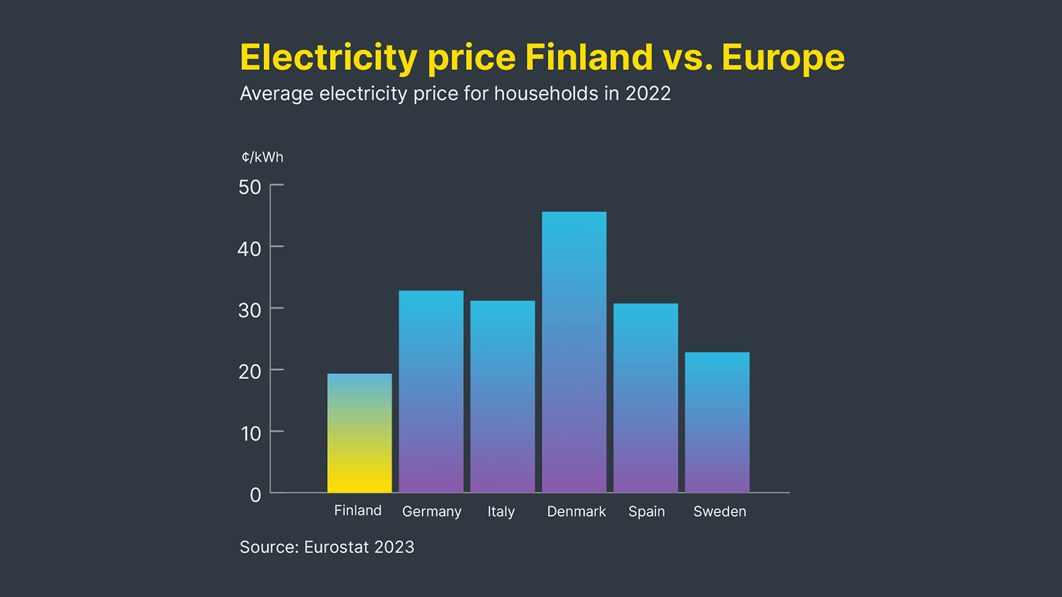 Energy price and availability, the grid coverage and quality, and taxation of electricity are all factors where Finland stands out. Electricity is affordable by European standards and its availability is secure. For example, in Finland, the average electricity price for households in 2022 was around 0.1934/kWh, while average prices in countries such as Germany, Italy and Spain were above €0.30/kWh.